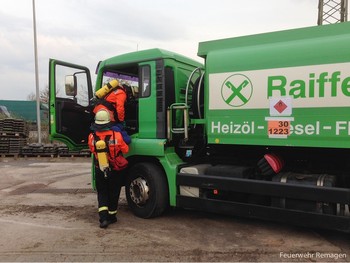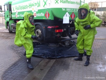 So führte die Feuerwehr am 1. April eine Übung zu diesem Thema durch, Mayk Patella und Carsten Delord, zuständig für die Fachgruppe Gefahrstoffe in der Einheit Remagen, hatten dazu einen Tankwagen organsiert, welcher von der Firma „AUTO – SCHÄFER Nutzfahrzeuge“ zur Verfügung gestellt wurde.