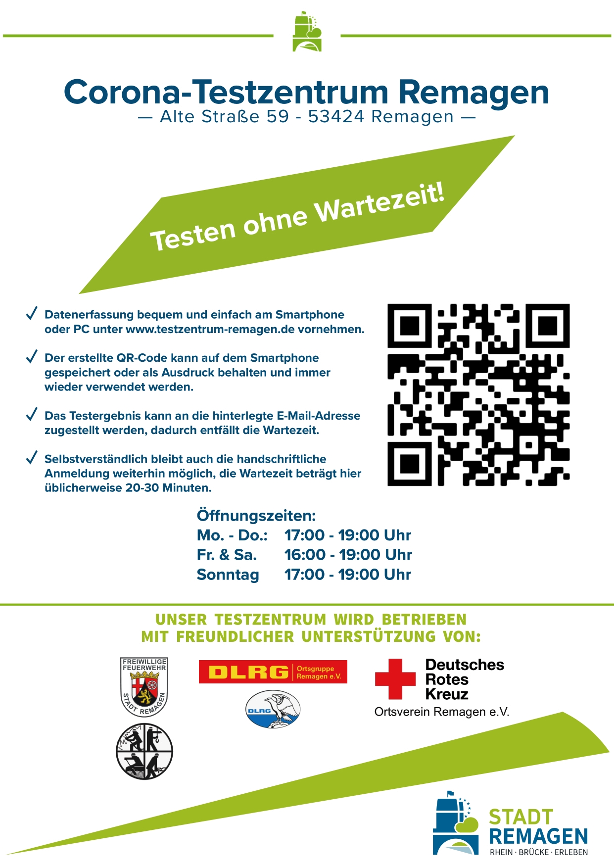 Ab sofort kann bequem und einfach unter „www.testzentrum-remagen.de“ die notwendige Datenerfassung am Smartphone oder PC selbst vorgenommen werden.