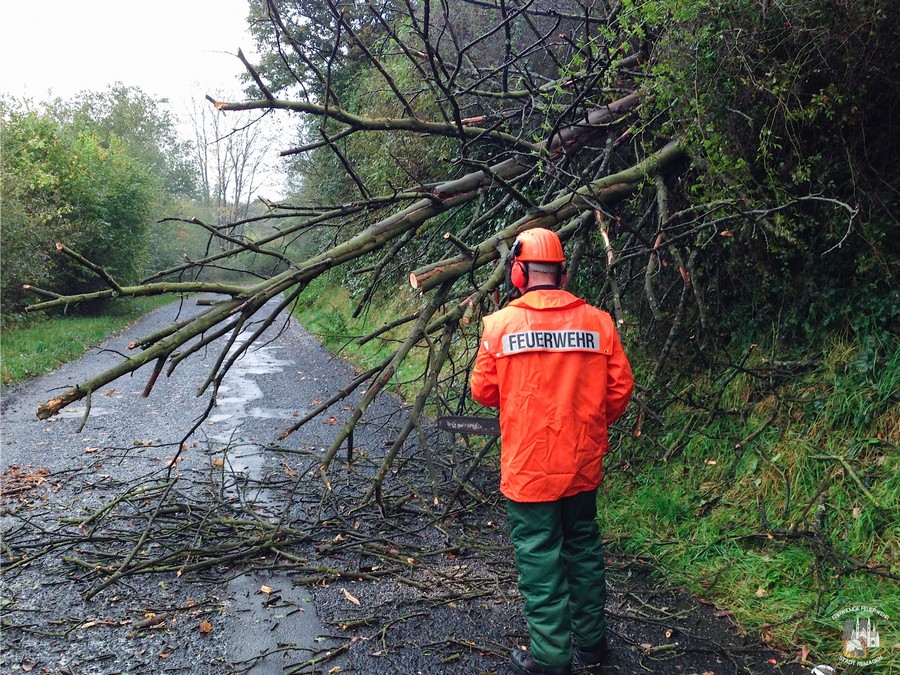 Die Einsatzkräfte der Stützpunktfeuerwehr rückten mit Kommandowagen, Tanklöschfahrzeug und Rüstwagen zur Einsatzstelle aus und sicherten diese zunächst ab. Anschließend zerkleinerten Wehrleute den Baum mit der Kettensäge und räumten das Holz von der Fahrbahn.