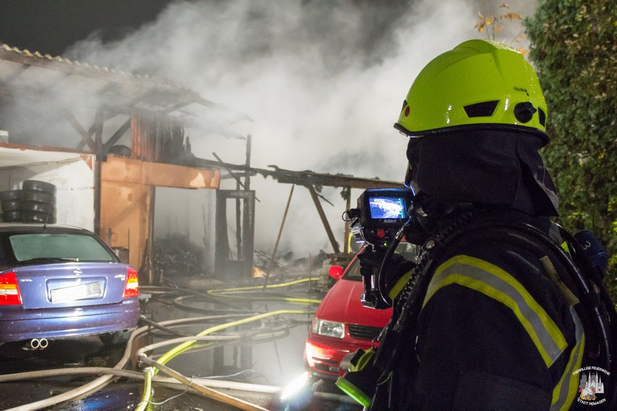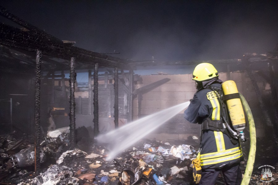 Sofort begannen mehrere Trupps unter Atemschutz mit der Brandbekämpfung, durch eine Riegelstellung konnte eine Brandausbreitung auf weitere angrenzende Garagen, Lagerhallen, Häuser und im Gefahrenbereich parkende Fahrzeuge verhindert werden.