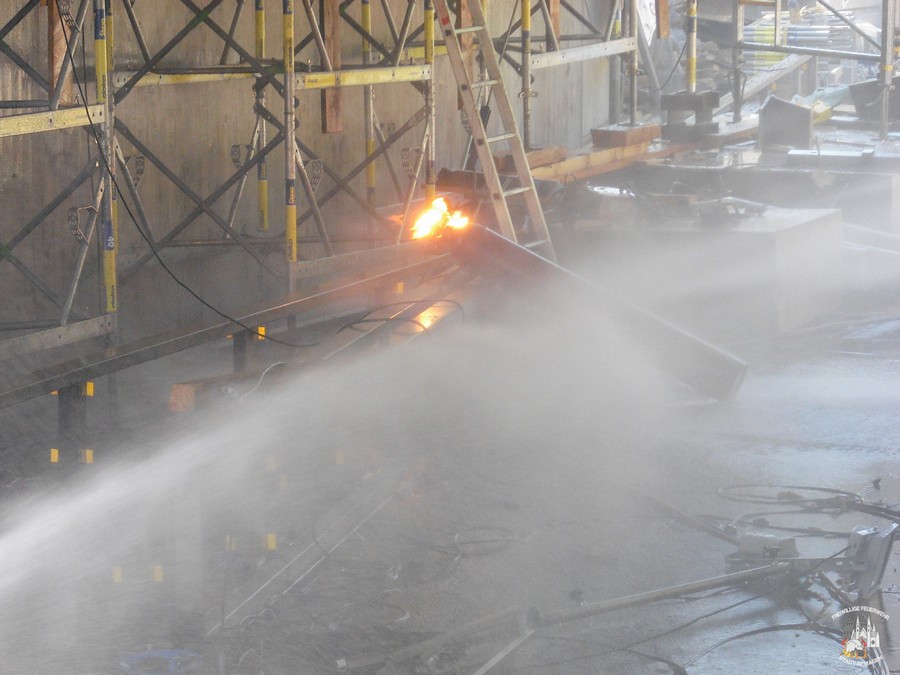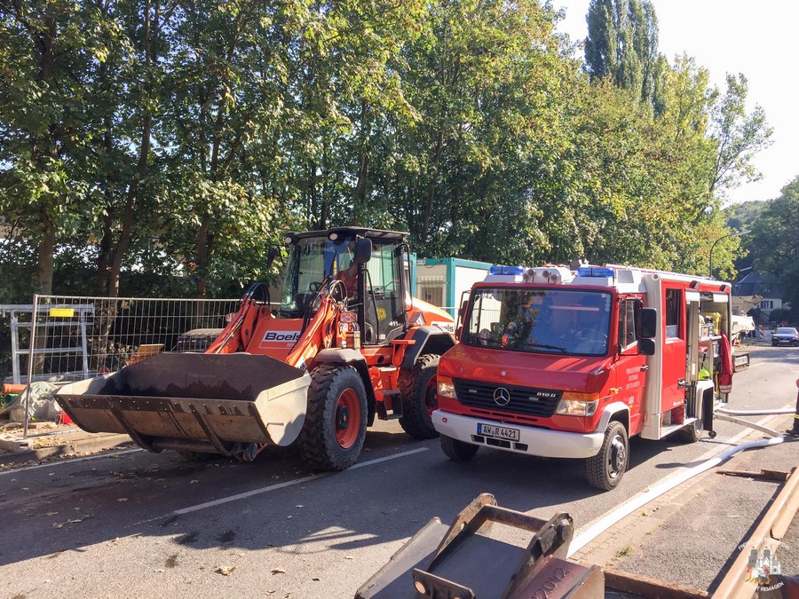 Bei Eintreffen der Feuerwehr entwich das Acetylen brennend aus einem defekten Ventil des Behälters. Zunächst wurde der Gefahrenbereich weiträumig abgesperrt und weitere noch intakte Gasflaschen mit technischem Gerät aus dem Gefahrenbereich geborgen. Die unmittelbare Einsatzstelle befand sich unterhalb einer neu errichteten Brücke, von zwei Seiten aus kühlten mehrere Trupps die Acetylenflasche mittels Wasser aus verschiedenen Strahlrohren. Die Feuerwehr Sinzig wurde ebenfalls zur Einsatzstelle alarmiert, sie verfügt über einen tragbaren Wasserwerfer. Nachdem dieser in Stellung gebracht worden war, konnten sich alle Einsatzkräfte, die zuvor gedeckt eingesetzt worden waren, zurückziehen. Nachdem die Flammen erloschen waren, wurde die Acetylenflasche geborgen und für weitere Kühlmaßnahmen in ein Wasserbad gebracht.
