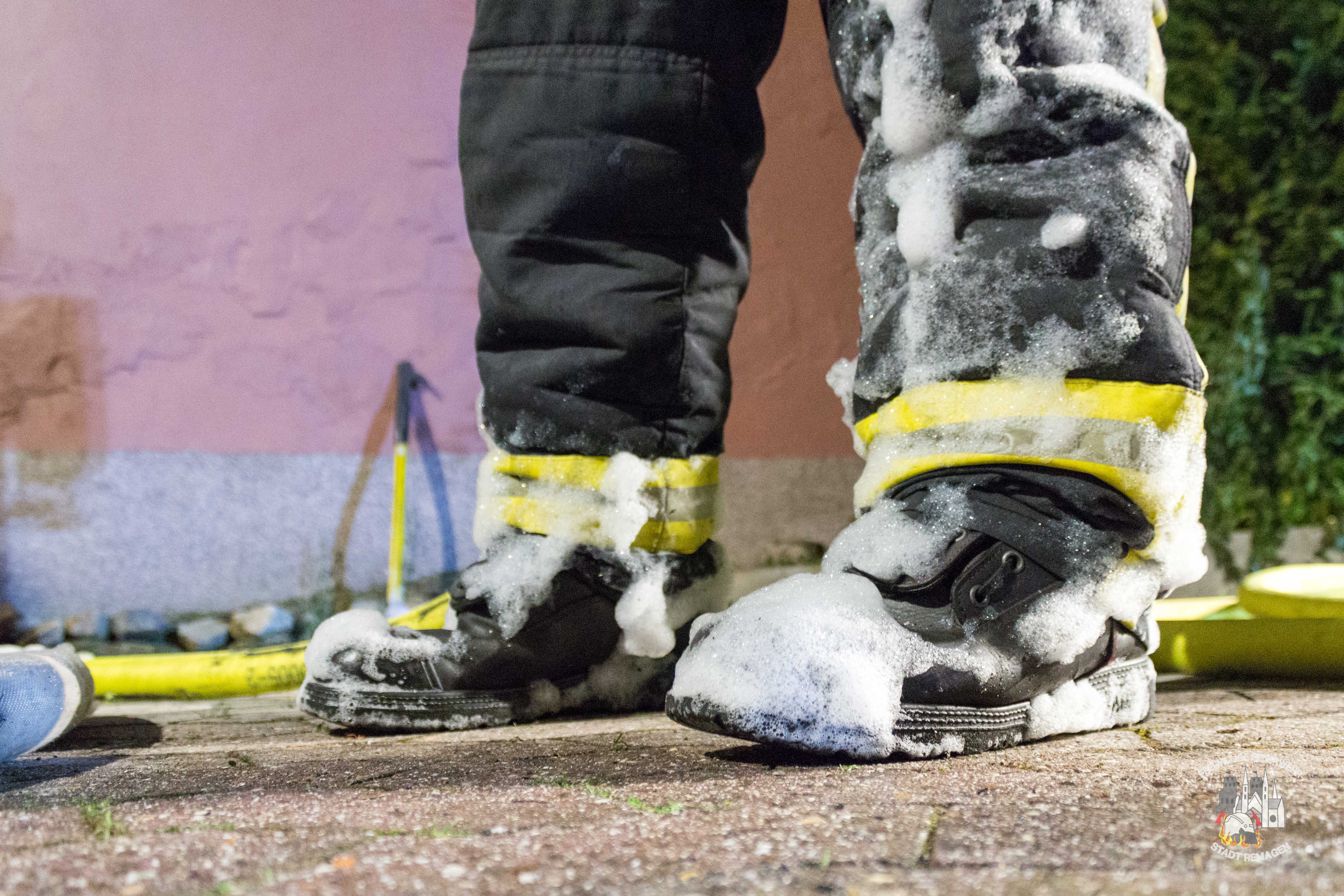 Als die ersten Einsatzkräfte der Feuerwehr gegen 23:30 Uhr in Bandorf eintrafen, stand die untere Etage eines zweigeschossigen Nebengebäudes im Vollbrand. Die Flammen griffen von dem als Schuppen und Garage genutzten Anbau auf ein benachbartes Wohngebäude über. Mit insgesamt vier Strahlrohren und der Drehleiter bekämpften die Wehrleute den Brand und konnten diesen schnell unter Kontrolle bringen. Im Anbau wurde ein Schaumteppich ausgebracht um ein Wiederauflodern der Flammen zu verhindern. Zur Bekämpfung letzter Glutnester mussten Teile des Wohnhausdaches geöffnet werden.