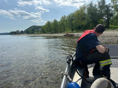 Da sich zwei mit Rettungswesten ausgestattete Personen im Wasser befanden, rückte die Feuerwehr Oberwinter unter anderem mit dem Rettungsboot aus. Während der Anfahrt konnte sich eine Person schwimmend an den Fähranleger retten, während die andere Person an den Strand von Nonnenwerth getrieben wurde.