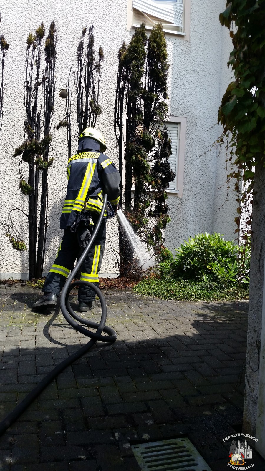 Die Leitstelle Koblenz alarmierte am Mittwochmittag die Kräfte der Einheit Remagen zu einem Kleinbrand. In einem Wohngebiet hatte sich eine Hecke bei Arbeiten im Garten entzündet. Als die Feuerwehr eintraf, war ein Großteil des Brandes mit einem Gartenschlauch bereits gelöscht. Der Feuerwehr blieben lediglich Nachlöscharbeiten mittels des Schnellangriffs vom Tanklöschfahrzeug. Durch ein gekipptes Fenster einer angrenzenden Wohnung, konnte sich die Rauchentwicklung dorthin ausbreiten, sodass die Wohnung noch belüftet wurde und ein Atemschutztrupp diese erkundete.