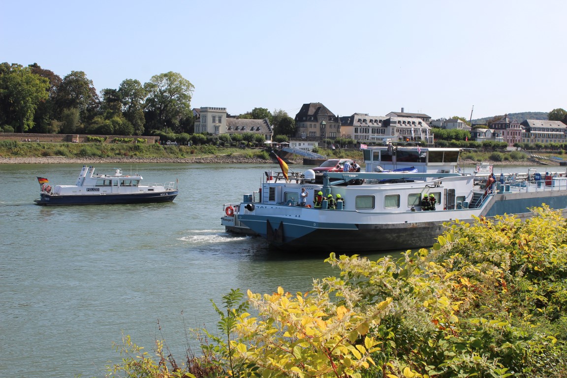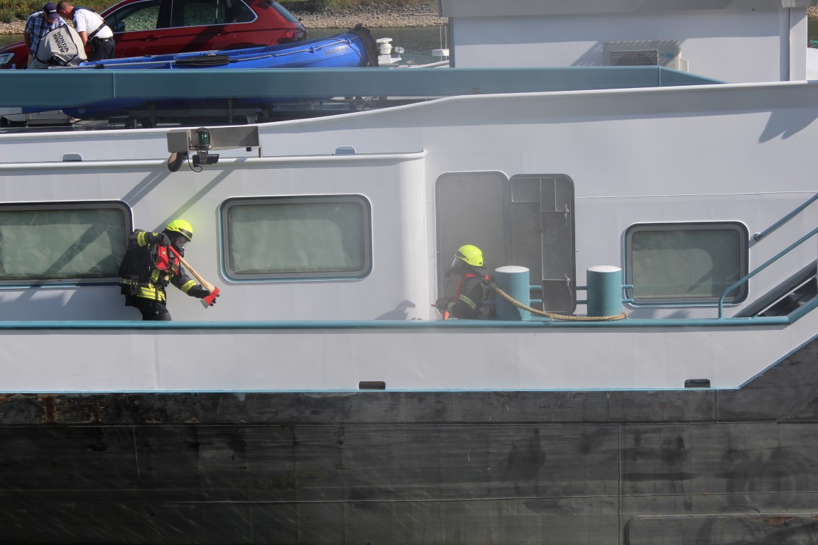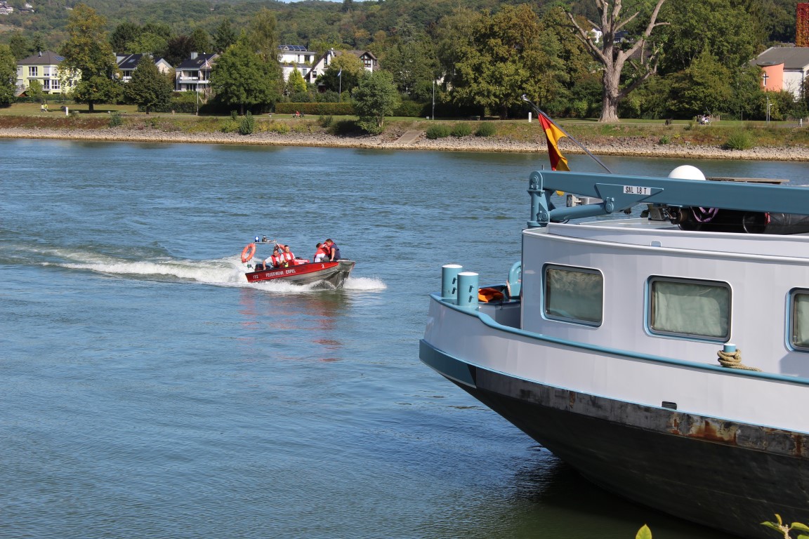 Mit dem Stichwort „Schiffsbrand auf dem Rhein“ wurden die Feuerwehren Remagen (linksrheinisch) und Unkel und Erpel (rechtsrheinisch) alarmiert. Kurz vor dem Unkelstein lag linksrheinisch, nahe am Ufer, ein Tankschiff. Nach ersten Angaben des Kapitäns kam es während der Bergfahrt plötzlich zu einer starken Rauchentwicklung im Motorraum seines Schiffes. Die eingesetzten Kräfte der Facheinheit Wasserschutz, unterstützt von Atemschutztrupps der Einheit Remagen gingen zur Erkundung und Brandbekämpfung in den Motorraum vor. Hier wurde eine starke Verqualmung festgestellt, die schließlich durch Entfernen von Isoliermaterial und Lüftung beseitigt werden konnte. Dennoch hatte sich in dem Motorraum die Hitze so gewaltig gestaut, dass sich ein Feuerwehrmann im ersten Angriff leichte Brandverletzungen zuzog und zur ambulanten Behandlung ins Krankehaus gebracht werden musste. Als mögliche Ursache wird ein Hydraulikschaden angenommen. Nach erfolgter Schaddensaufnahme durch die Wasserschutzpolizei und das Wasser- und Schifffahrtsamt konnte das Schiff mit eigener Kraft so verlegt werden, dass eine gefahrlose Reparatur möglich ist.