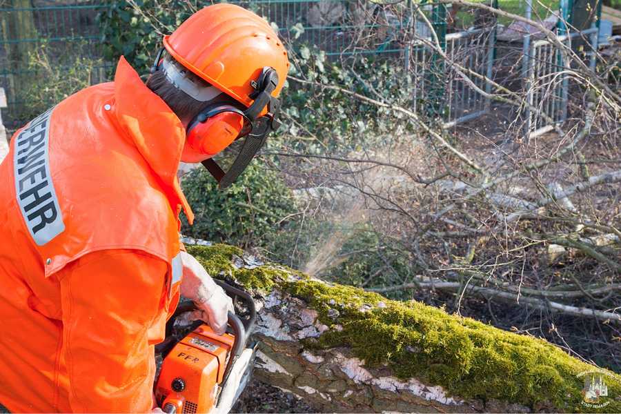 Mit der Kettensäge zerkleinerten die Einsatzkräfte das Holz, nach etwa einer Stunde war auch hier „Einsatzende“.