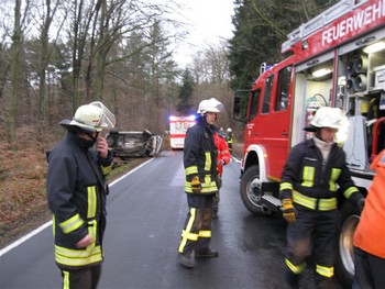 Remagen/ L79. Am heutigen Morgen gegen 08:30h wurde die Einheit Remagen zum 2ten Einsatz des Tages mit der Einsatzmeldung: Verkehrsunfall mit eingeklemmter Person über Meldeempfänger und Sirene durch die Pi Remagen alarmiert. Schon während der Anfahrt zur Einsatzstelle wurde die Einheit Rolandswerth, zur Unterstützung mit der zweiten Rettungsschere, durch die FEZ nachalarmiert. Bei zeitgleichem Eintreffen des TLF16/25 und dem RW1 konnte durch den Einsatzleiter folgende Lage festgestellt werden: Ein PKW(VAN) lag in Seitenlage im Straßengraben, die Fahrerin war durch den Rettungsdienst bereits befreit worden. Aufgrund der vorgefundenen Lage konnten alle weiteren sich auf der Anfahrt befindlichen Fahrzeuge den Einsatz abbrechen. Neben der Sicherstellung des Brandschutzes wurde mittels Körperkraft der Einsatzkräfte das Unfallfahrzeug aufgestellt und mit der Seilwinde des Rüstwagens aus dem Graben gezogen. Im weiteren Verlauf, wurde die Fahrzeugbatterie abgeklemmt und die Einsatzstelle der PI Remagen übergeben.