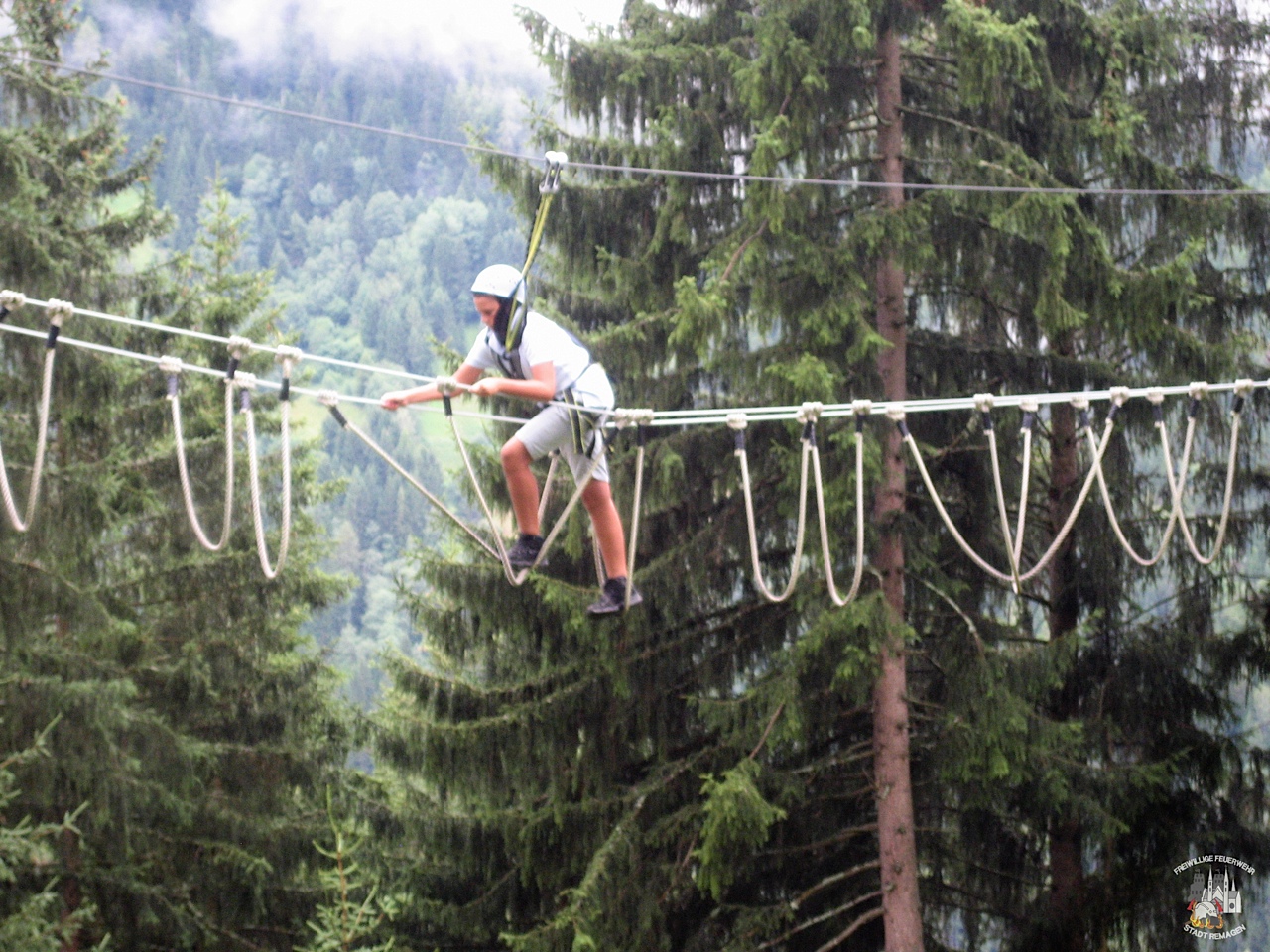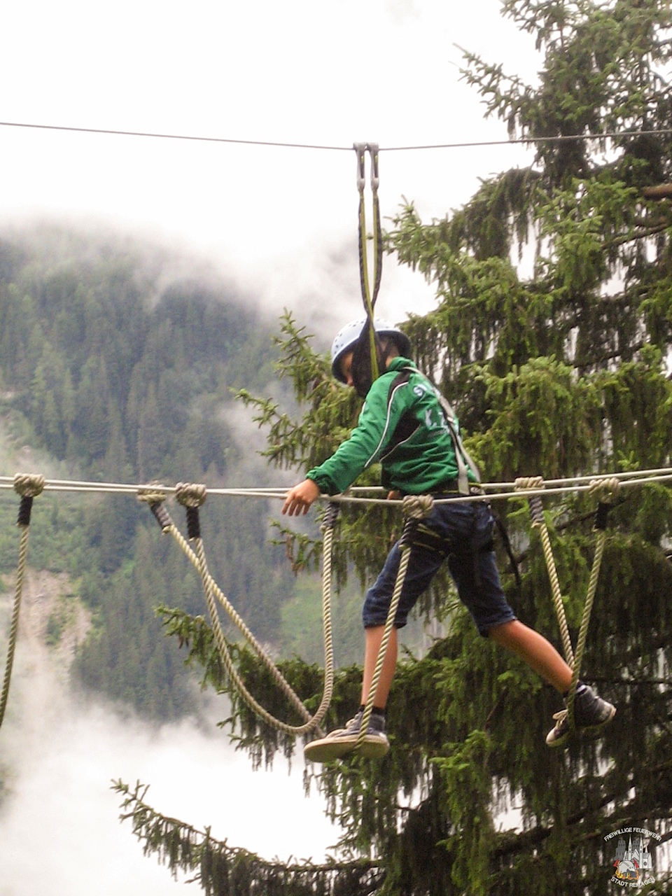 Am nächsten Morgen wurde reichlich gefrühstückt und die Zimmer in Schuss gebracht. Um 11 Uhr stand dann ein Besuch des XP Abendteuerpark am Hochzeiger an, alle wurden mit einem Helm und Sicherheits- Gurt ausgestattet – dann ging es nach einer Einweisung im Alpin Center durch das Fachpersonal auch schon los. Der Hochseilgarten war eine Kombination aus Naturhoch- und Waldseilgarten mit über 59 Übungen und Seilrutschen. Die größte Seilrutsche war der Flying Fox über einer Schlucht mit Wasserfall mit einer Länge von ca. 60 m. Nach einem so aufregenden Nachmittag war dann das kühle Nass in einem ellen und Walzen ohne kentern zu bezwingen. Am Nachmittag wurde die Stadt Imst besucht wo jeder die Möglichkeit hatte, etwas einzukaufen. Abends wurde ein Lagerfeuer entzündet und es wurde später Stockbrot mit allen Kids und Betreuen zubereitet.