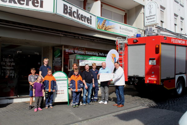 Firmeninhaber Schmickler übergibt der Kreisjugendfeuerwehr Ahrweiler einen Spendenscheck aus dem Verkaufserlös des „Feuerwehrbrotes“.