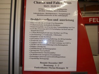 Das Fahrgestell ist ein MAN -TGM 15.280 ( 15 Tonnen Fahrgestell mit einem 6 Zylinder 280 PS Dieselmotor) mit Automatikgetriebe. Der Aufbau wurde, wie schon beim Vorgängermodell, durch die Fa. Metz in Karlsruhe gefertigt. Die Metz L32 (DLAK 23/12 ) besitzt eine Einsatzhöhe von 32 Metern und ist eine vollautomatische , hydraulische Drehleiter. Das Hubrettungsfahrzeug garantiert eine Nennrettungshöhe von 23 m bei einer Nennausladung von 12m. Der Rettungskorb ist für 3 Personen mit einer maximalen Korblast von 270 kg ausgelegt. Eine CAN-Bus Steuerung mit LCD Farbdisplays im Korb und am Hauptbedienstand erleichtert den Maschinisten das Führen des Gerätes. Neben den gem. der Normen verlasteten Gerätschaften wurden zusätzlich noch folgende Änderungen vorgenommen: Auf dem Beifahrersitz wurde ein Pressluftatmer zum sofortigen Ausrüsten während der Einsatzfahrt eingebaut, um sofort nach Erreichen der Brandstelle einsatzbereit zu sein. Schleuderketten , um auch bei winterlichen Gegebenheiten sicher und relativ schnell den Einsatzort erreichen zu können. Zusätzlich zur Normbeladung befindet sich auf dem Fahrzeug, eine elekt. Kettensäge, eine Rettungssäge ( um Blech-,Eternitdächer u.s. Materialien zu trennen), ein Rollgliss ( zum Abseilen aus dem Korb, oder zum Retten aus Höhen u. Tiefen), eine Schleifkorbtrage mit Rettungsspinne, sowie ein Sprungretter Typ Lorsbach und ein wasserbetriebener Überdrucklüfter. Weiterhin wurde durch die Stadt Remagen ein Navigationsgerät angeschafft, um das Auffinden der Einsartstelle zu erleichtern. Außerdem wurde durch den Förderverein der FF Remagen eine Rückfahrkamera sowie zusätzliche Rückfahrscheinwerfer angeschafft. Sie dienen der Sicherheit beim Rangieren. Die offizielle Einsegnung und Übergabe ist für einen späteren Zeitpunkt vorgesehen, dieser wird rechtzeitig bekannt gegeben.
