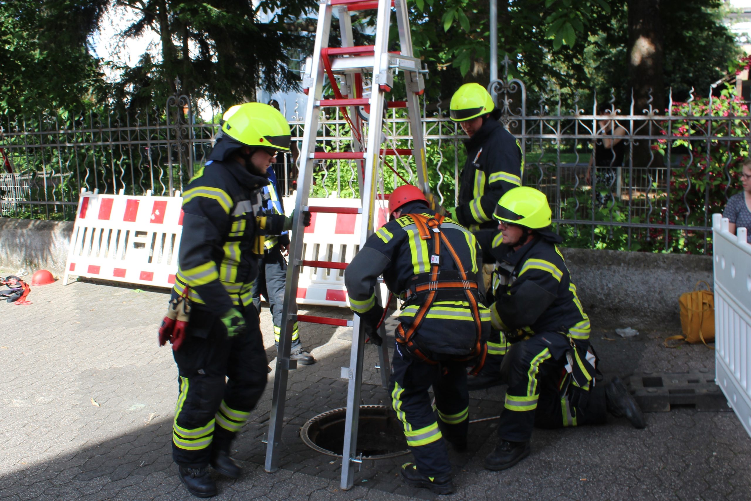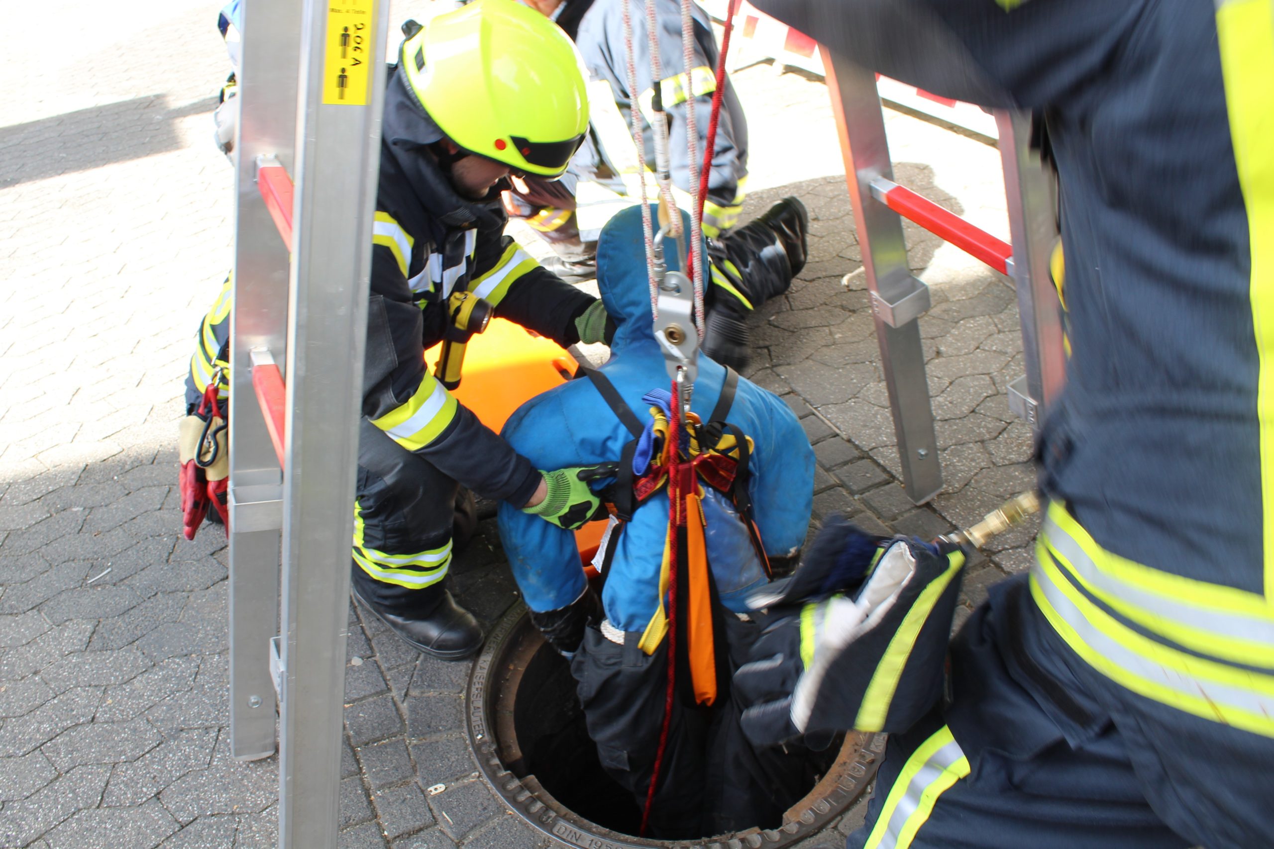 Die traditionelle Showübung der Einsatzabteilung durfte ebenso wenig fehlen. Demonstriert wurde in diesem Jahr die Rettung eines verunglückten Arbeiters aus einem Kanalschacht. Dazu wurde mittels eines Rollglis (einer Art Flaschenzug) ein Feuerwehrmann zum verunglückten hinab gelassen, und anschließend beide auf dem selben Weg wieder an die Oberfläche geholt.